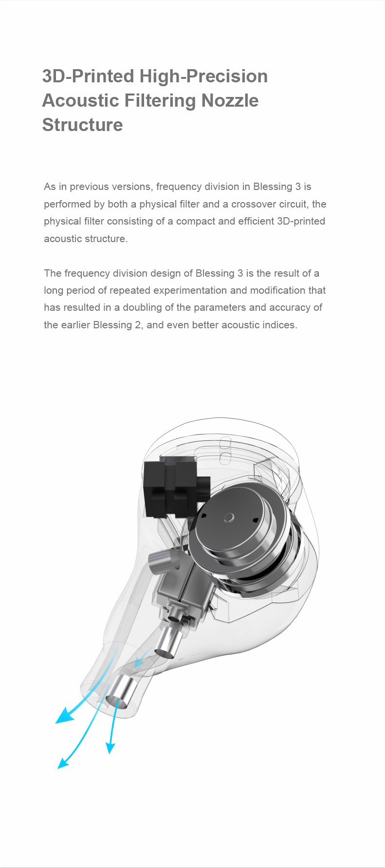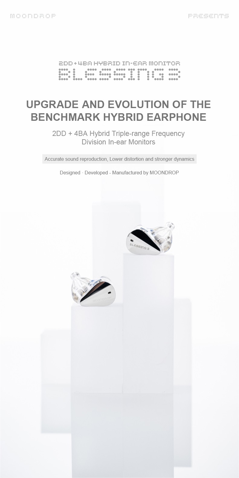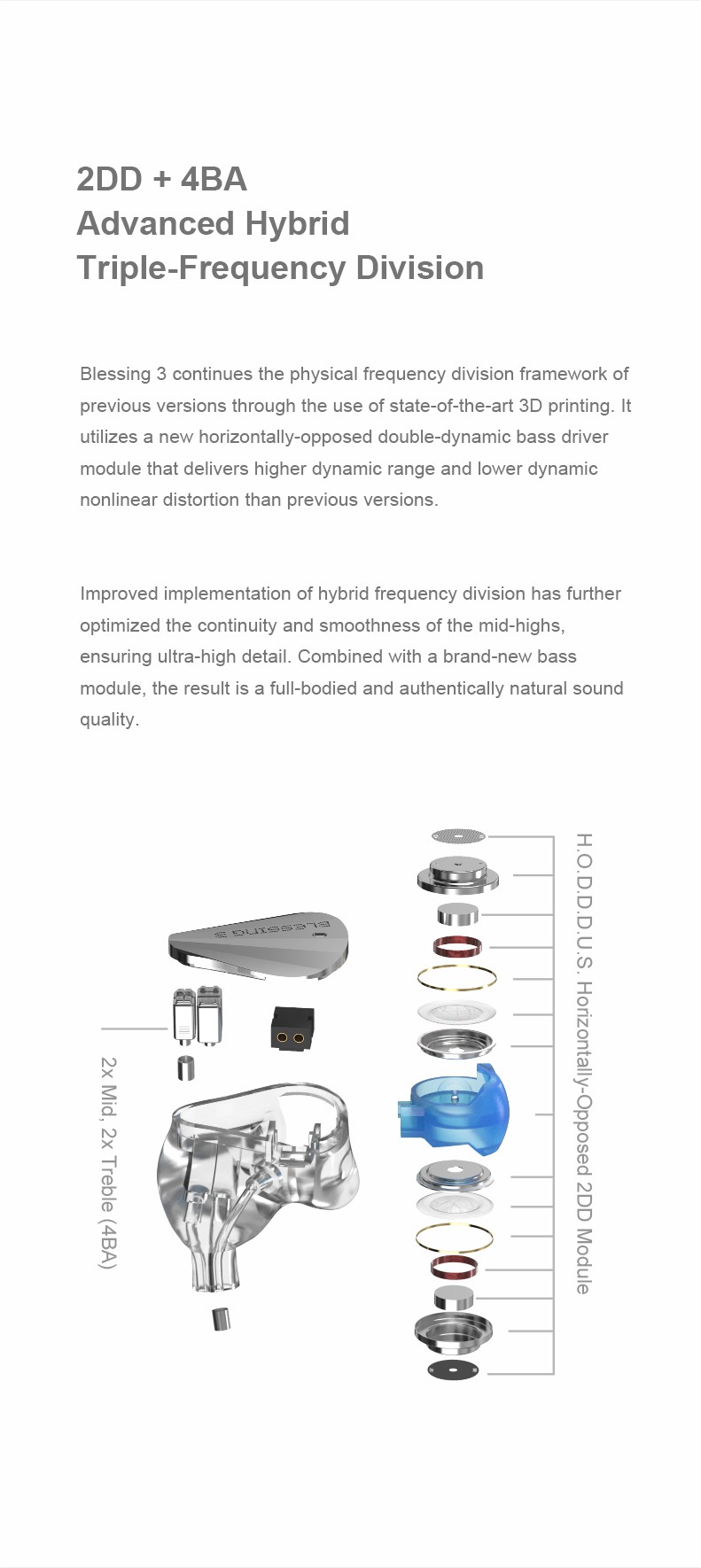 2. Blessing 3 utilizes a new horizontally-opposed double-dynamic bass driver module that delivers higher dynamic range and lower dynamic nonlinear distortion than previous versions.