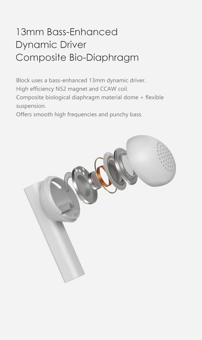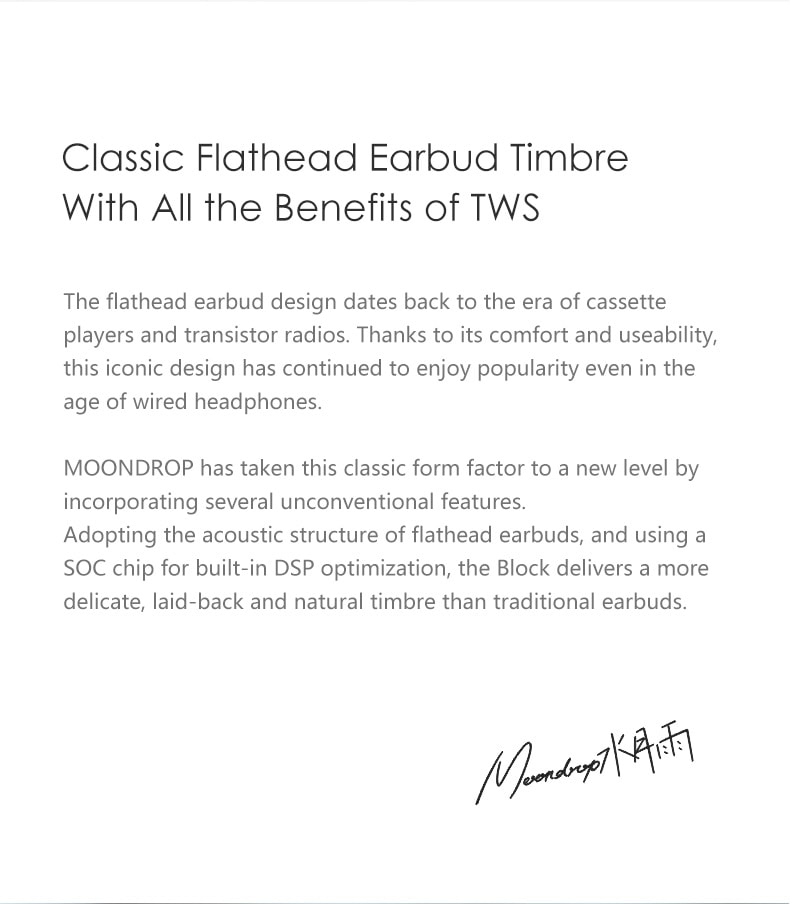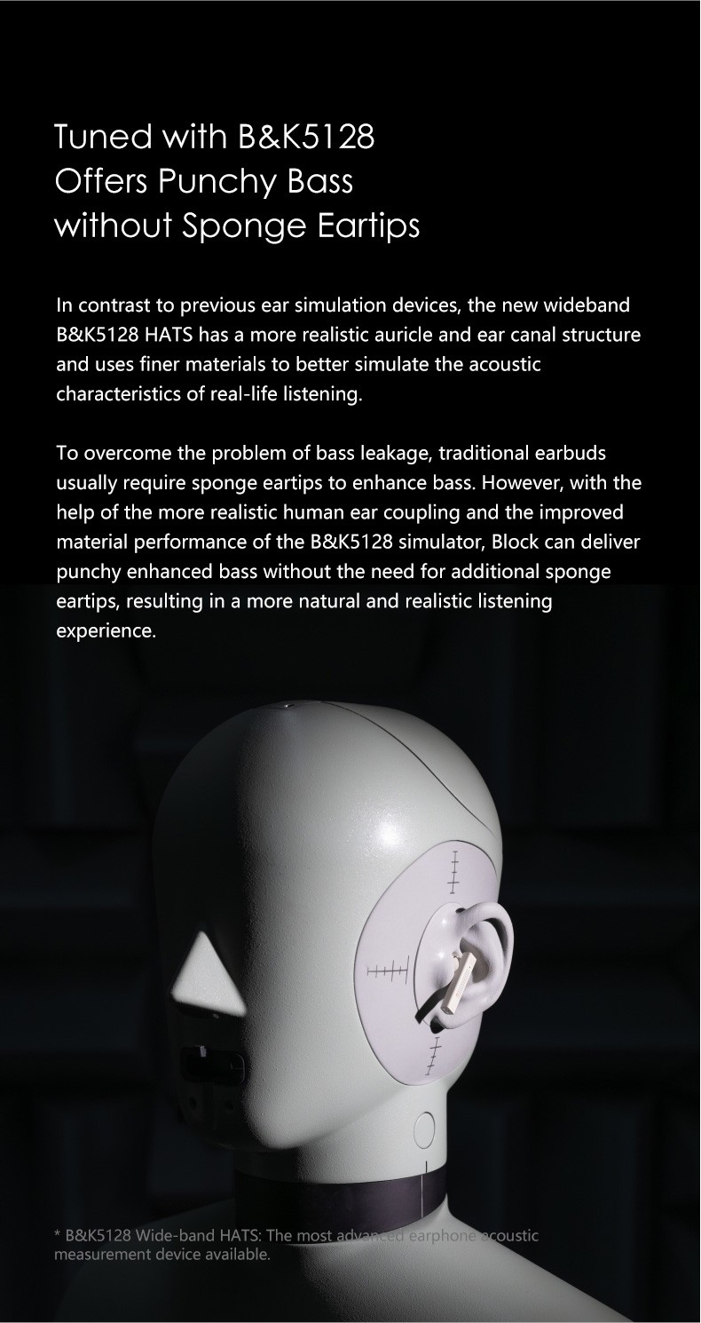 Adopting the acoustic structure of flathead earbuds, and using a SOC chip for built-in DSP optimization, the Block delivers a more delicate, laid-back and natural timbre than traditional earbuds.