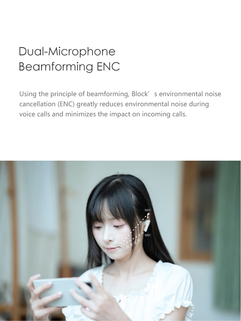 Using the principle of beamforming, Block’s environmental noise cancellation (ENC) greatly reduces environmental noise during voice calls and minimizes the impact on incoming calls.