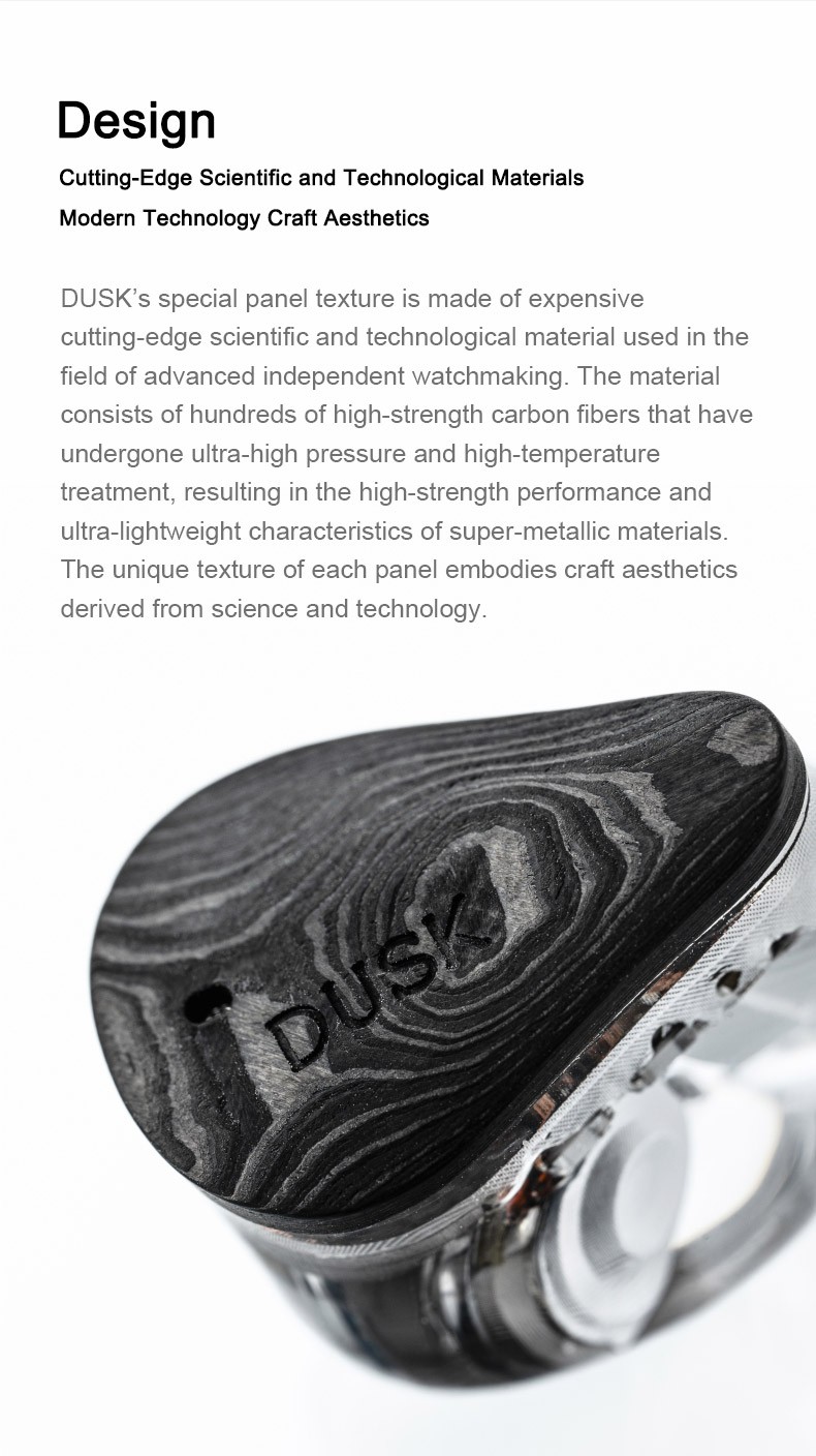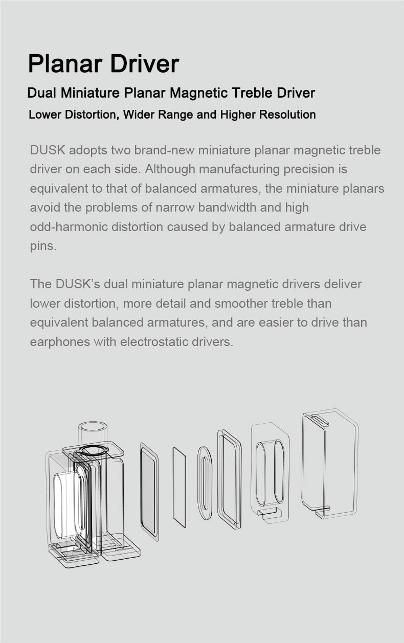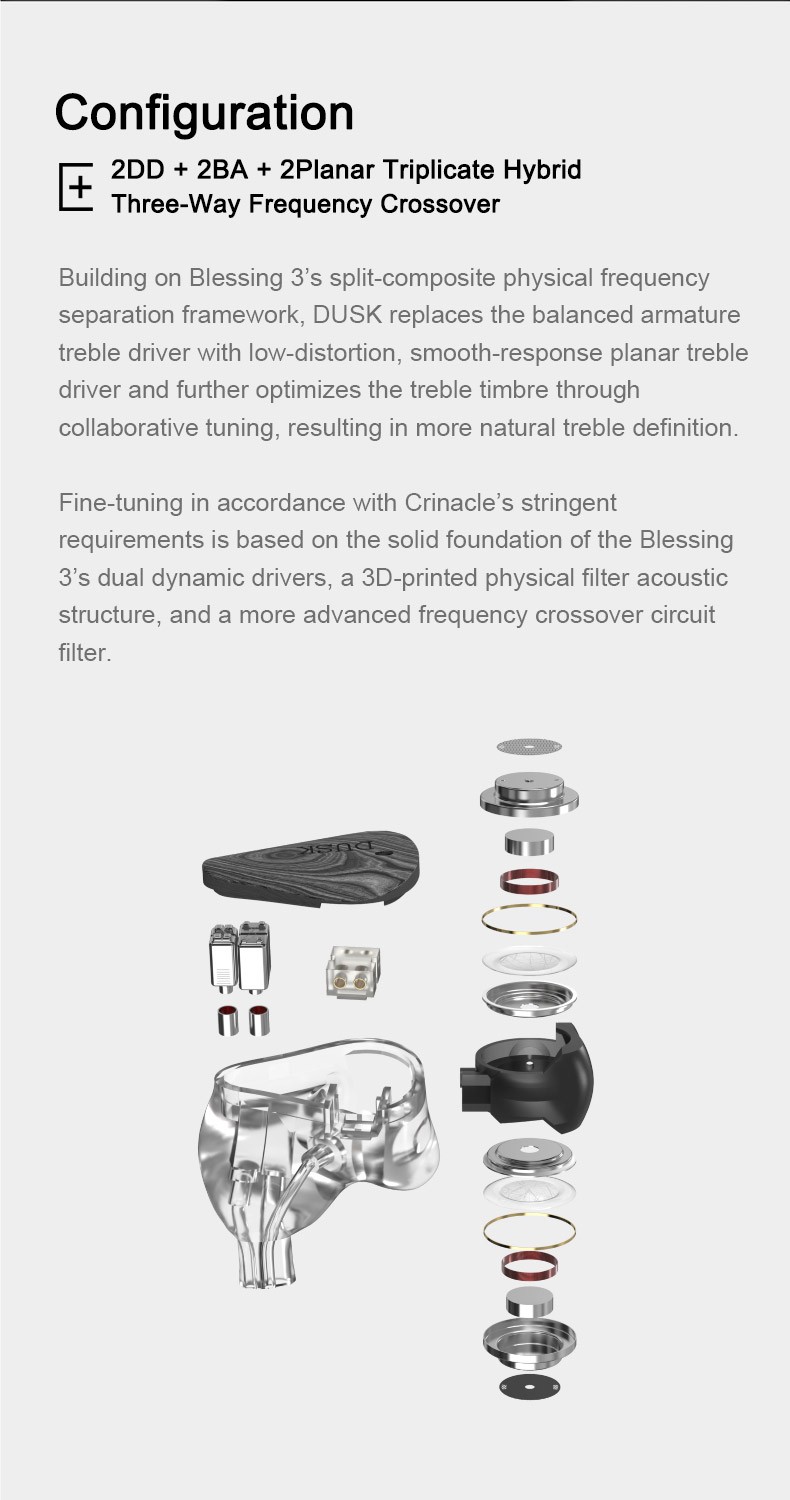 Building on Blessing 3’s split-composite physical frequency separation framework, DUSK replaces the balanced armature treble driver with low-distortion, smooth-response planar treble driver and further optimizes the treble timbre through collaborative tuning, resulting in more natural treble definition.