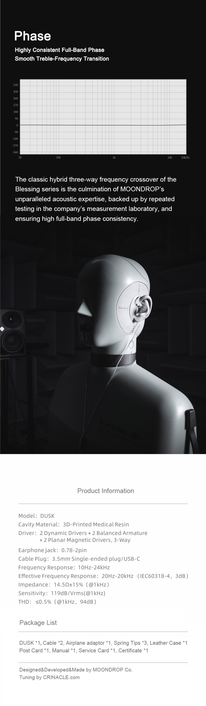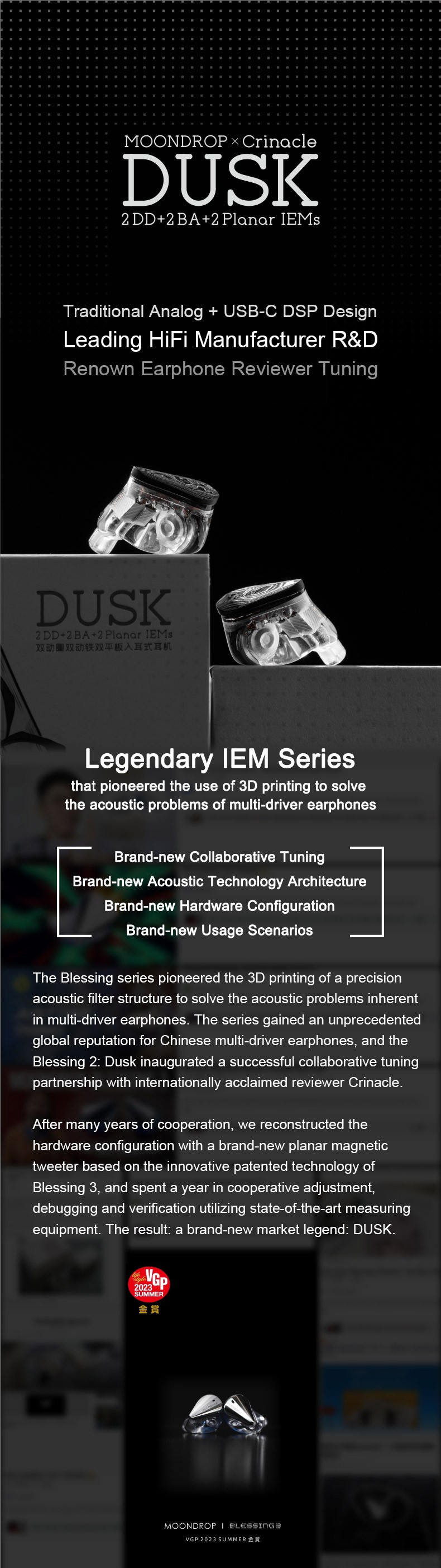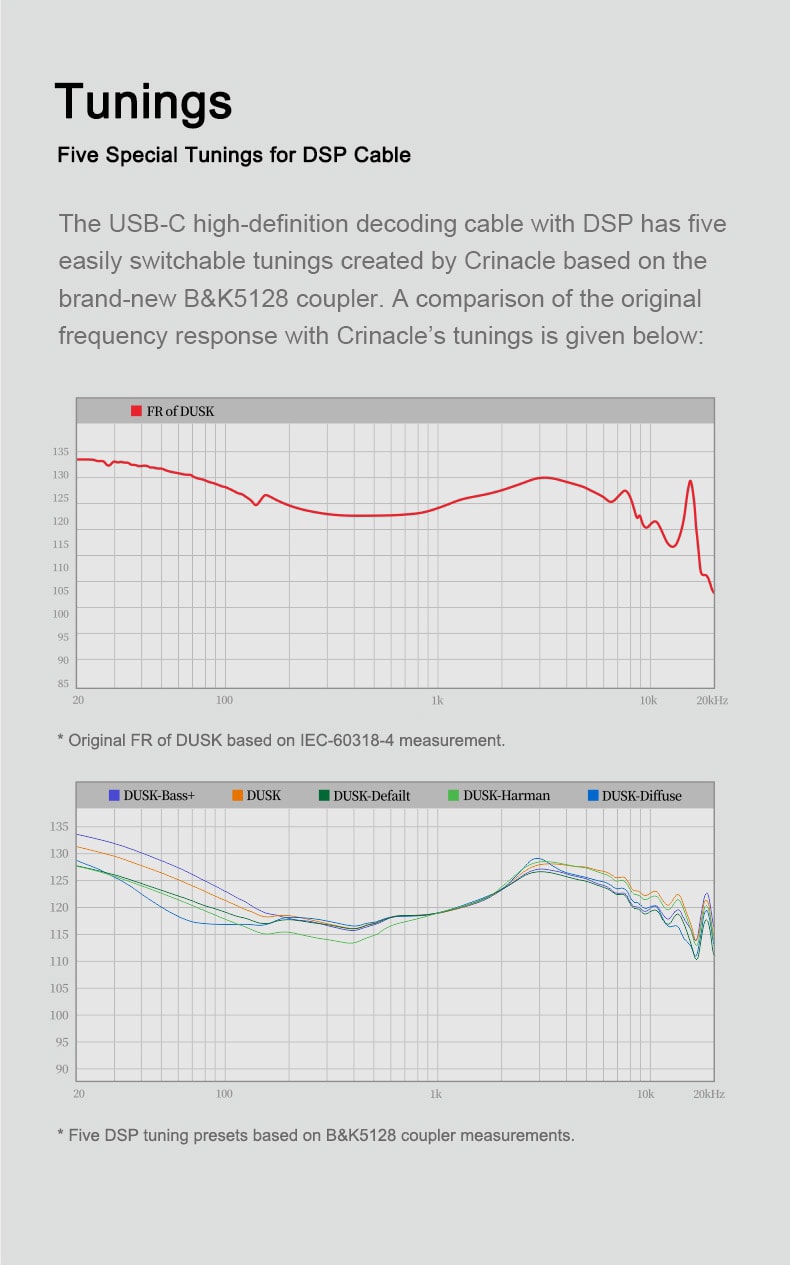 Building on Blessing 3’s split-composite physical frequency separation framework, DUSK replaces the balanced armature treble driver with low-distortion, smooth-response planar treble driver and further optimizes the treble timbre through collaborative tuning, resulting in more natural treble definition.