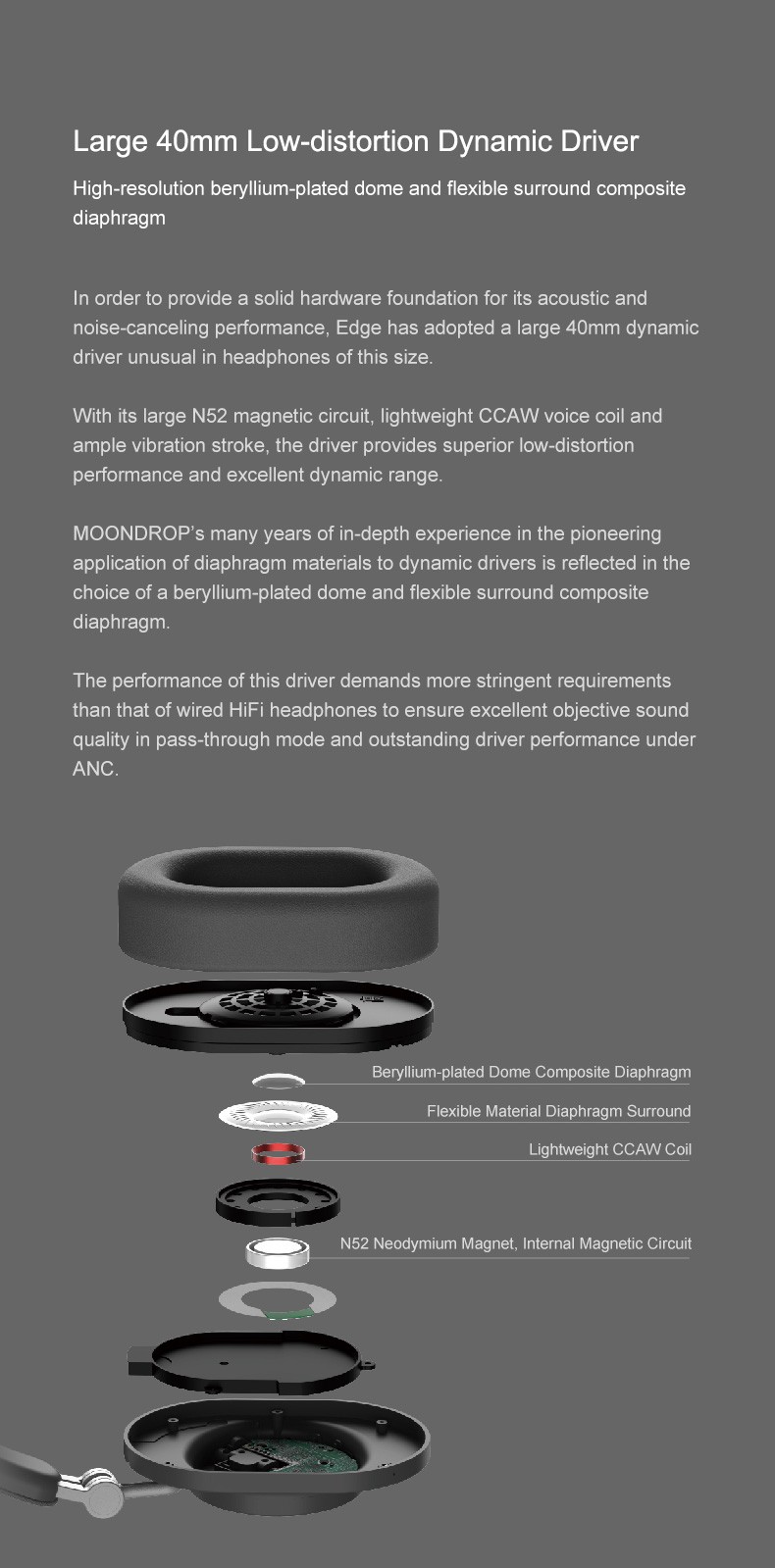 Large 40mm low-distortion dynamic driver, High-resolution beryllium-plated dome and flexible surround composite diaphragm.