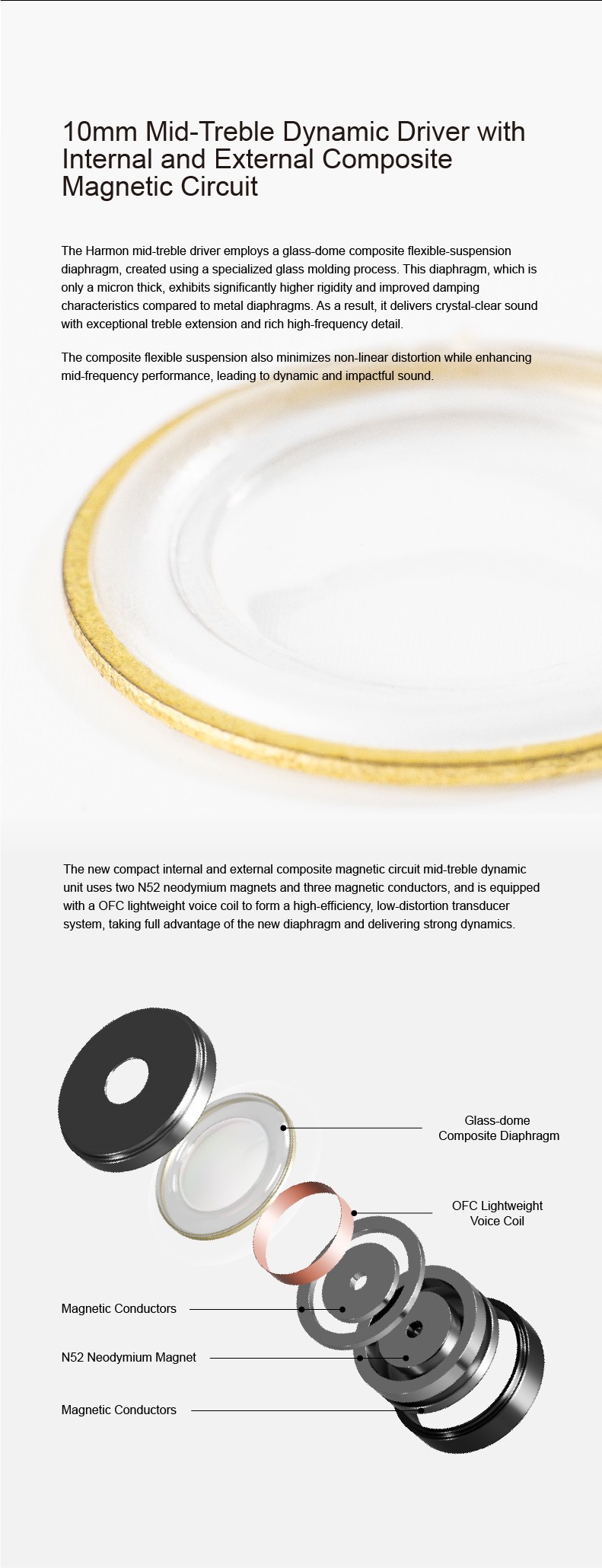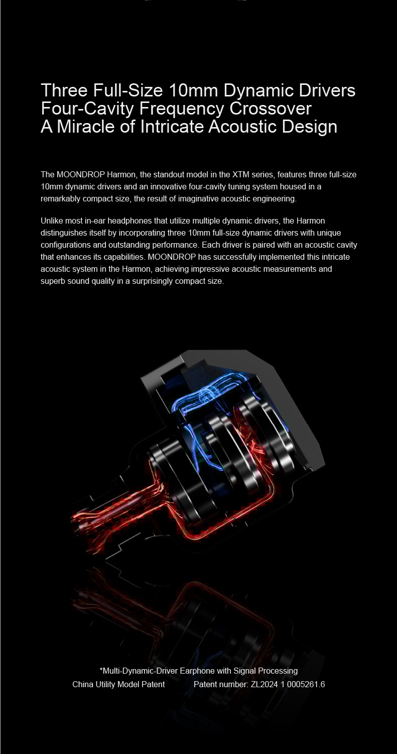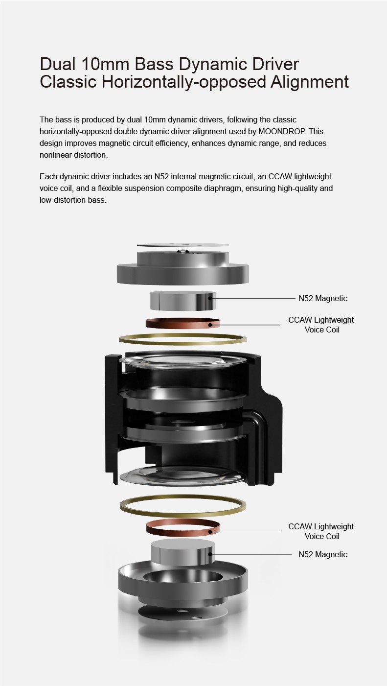 Driver Configuration: 10mm Dynamic Driver with Glass Dome Composite Diaphragm + Dual 10mm Paper Cone Composite Diaphragm Bass Dynamic Driver(H.O.D.D.D.U.S.)