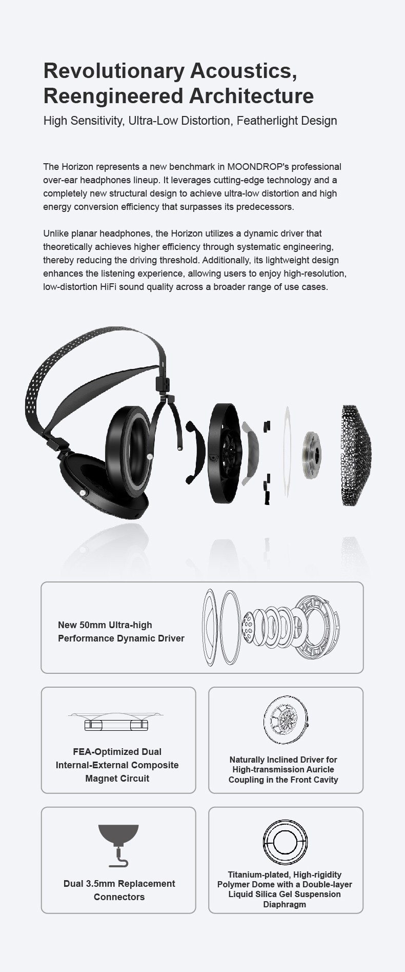 Revolutionary Acoustics, Reengineered Architecture, High Sensitivity, Uitra-Low Distortion, Featherlight Design