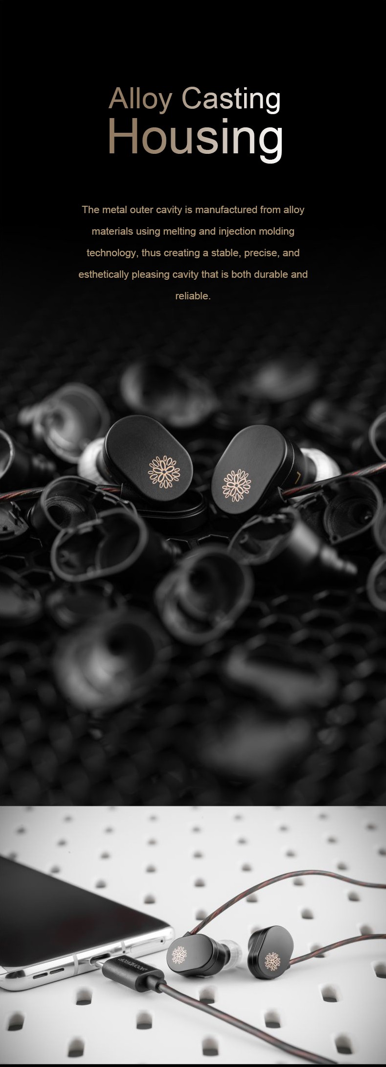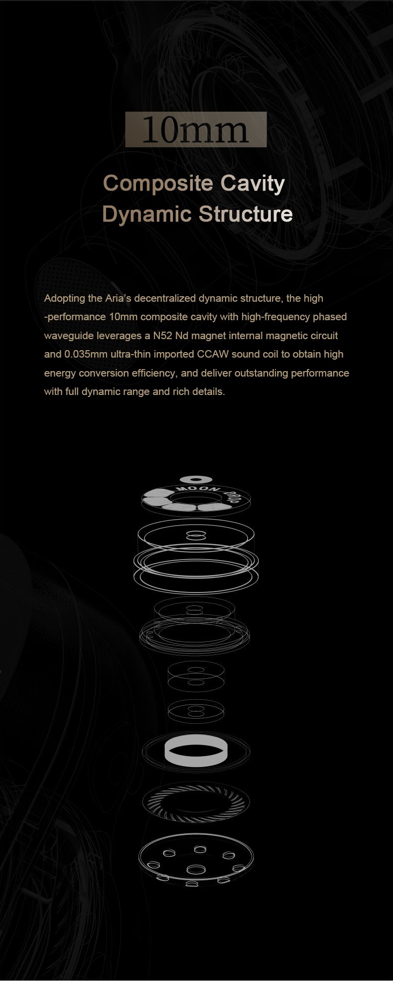 4. Adopting the Aria's decentralized dynamic structure, the high-performance 10mm composite cavity with high-frequency phased waveguide leverages a N52 Nd magnet internal magnetic circuit and 0.035mm ultra-thin imported CCAW sound coil to obtain high energy conversion efficiency, and deliver outstanding performance with full dynamic range and rich details.