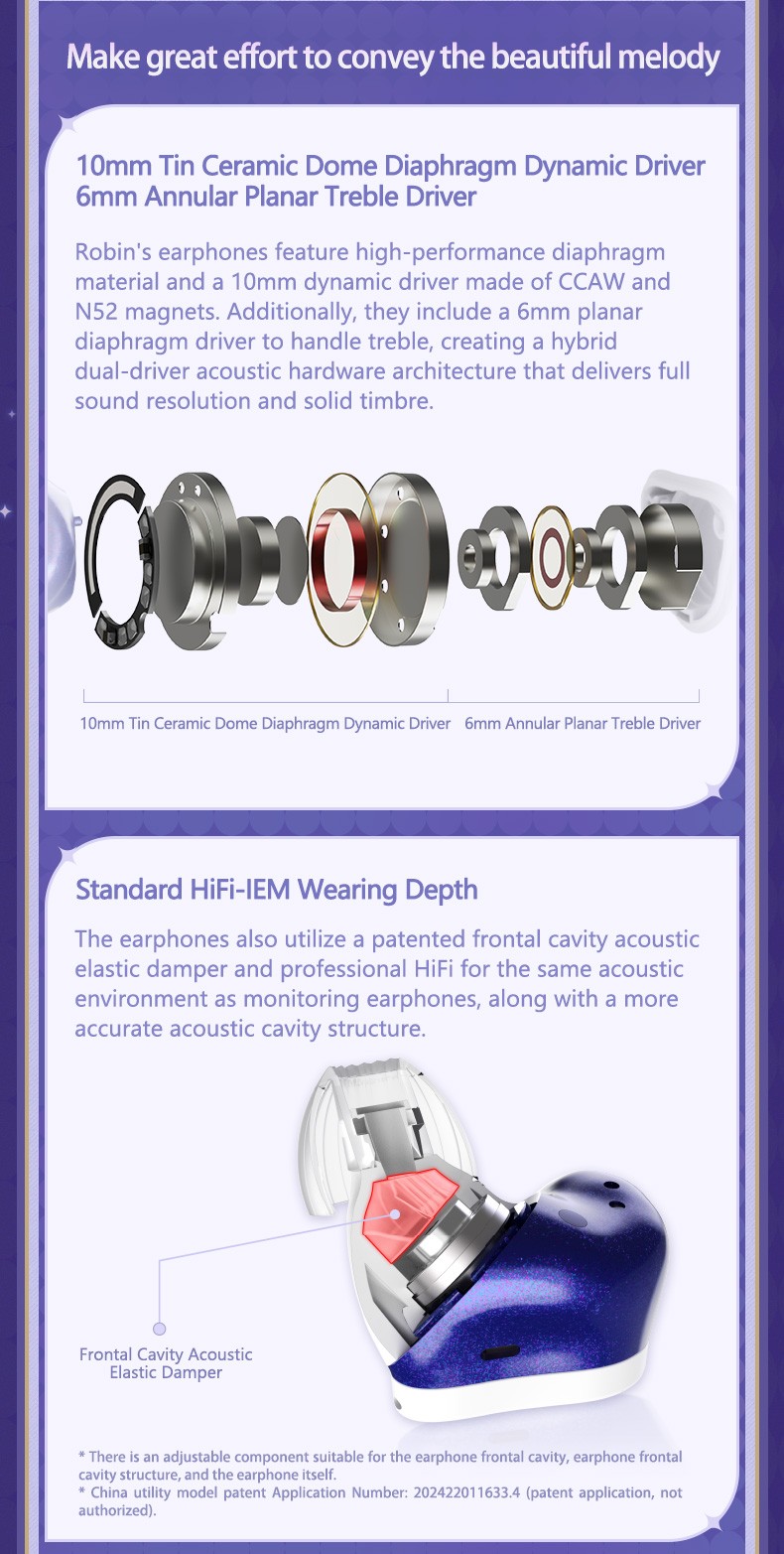 10mm Tin ceramic dome diaphragm dynamic driver + 6mm annular planar treble driver
