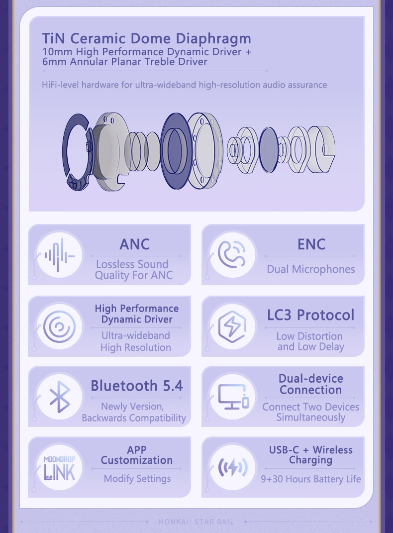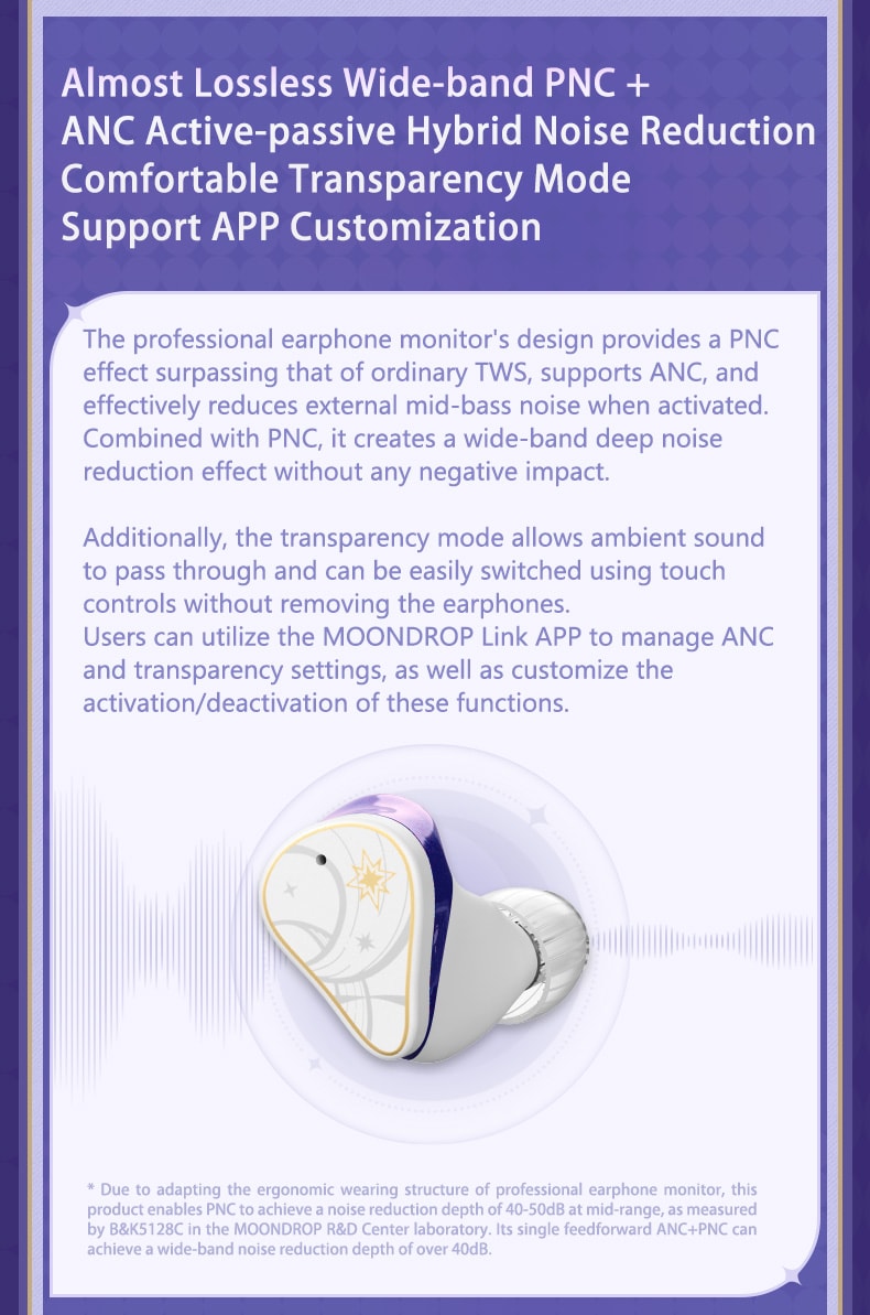 Almost lossless wide-band PNC + ANC active-passive hybrid noise reduction. Comfortable transparency mode, Support APP customization