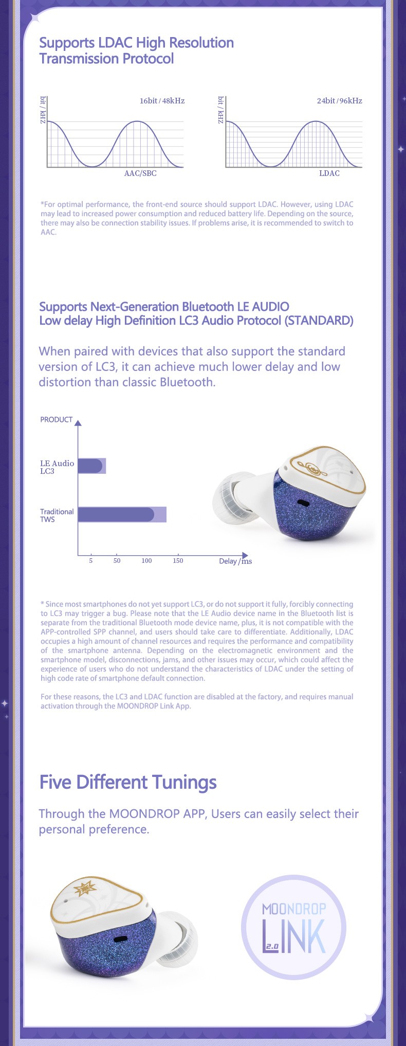 Supports LDAC high resolution transmission protocol, Supports Next-Generation Bluetooth LE AUDIO, Low delay high definition LC3 audio protocol (STANDARD)
